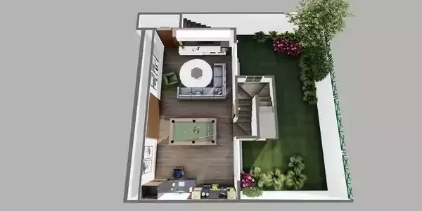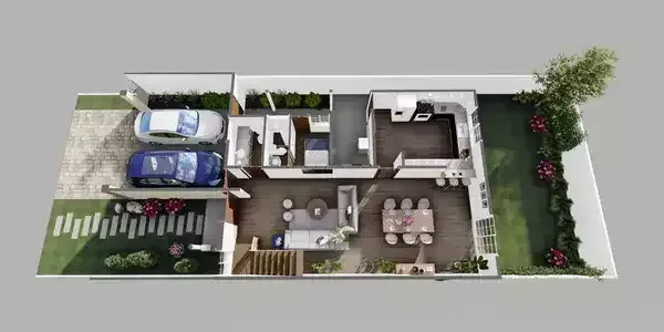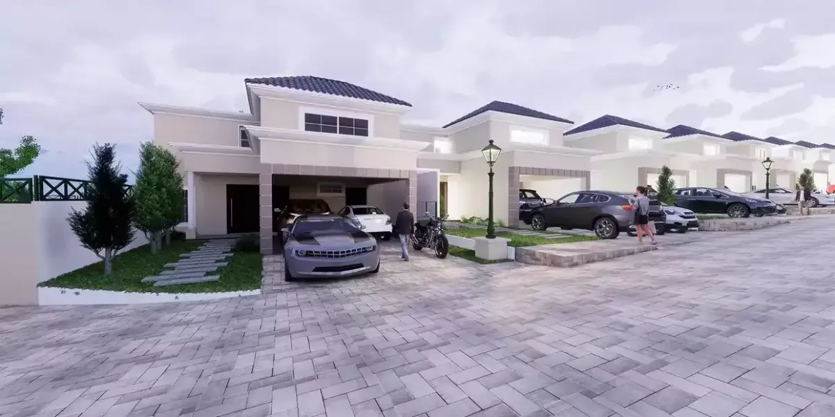 Parqueo techado para 2 vehículos compactos al frente de la residencia.